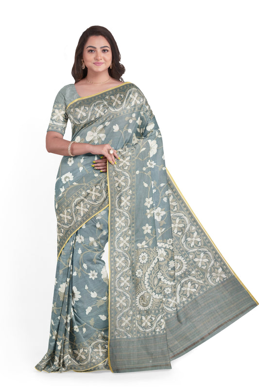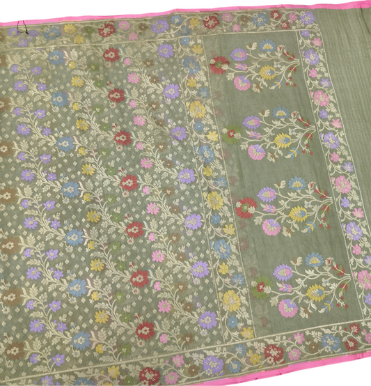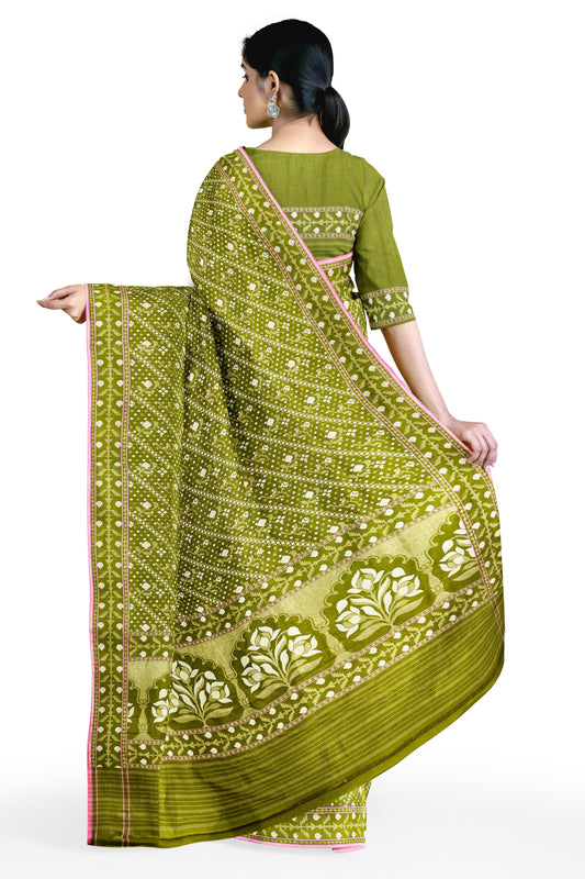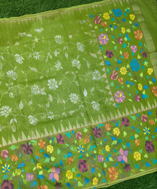 Olive pure cotton jamdani cutwork jaal banarasi saree
