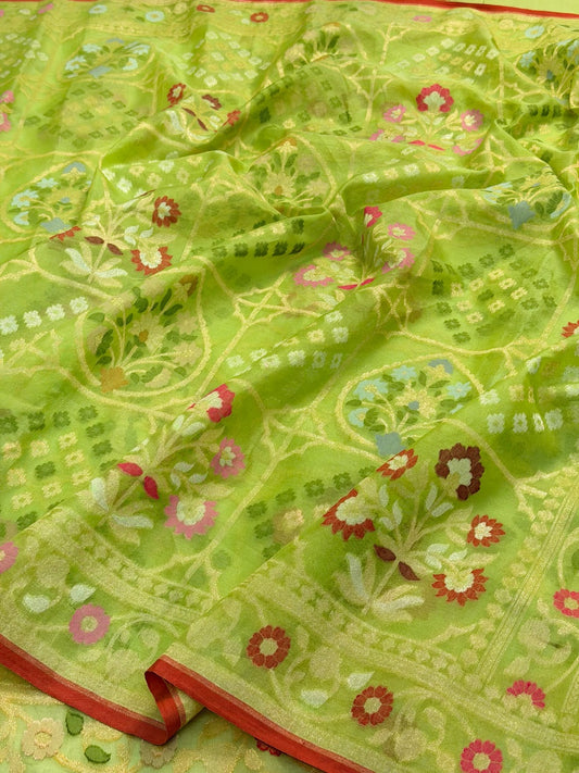 Pista Greren Banarasi Kora Jamdani Silk Handwoven Saree