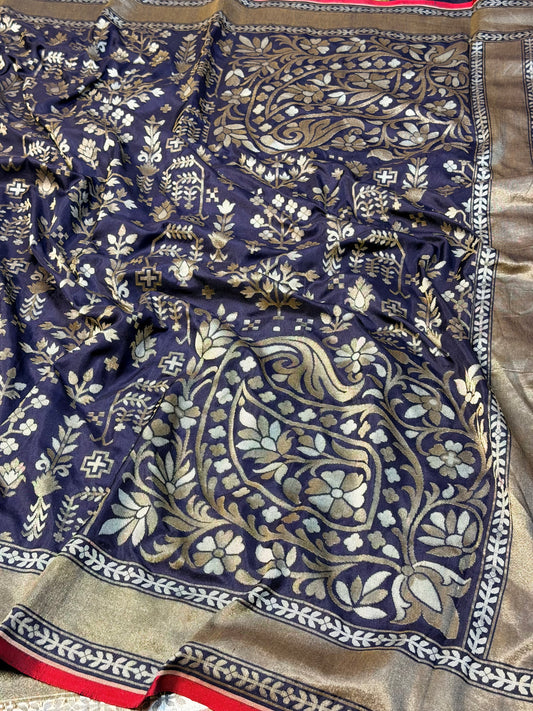 Navy blue pure katan silk ektara jamdani cutwork jaal banarasi saree