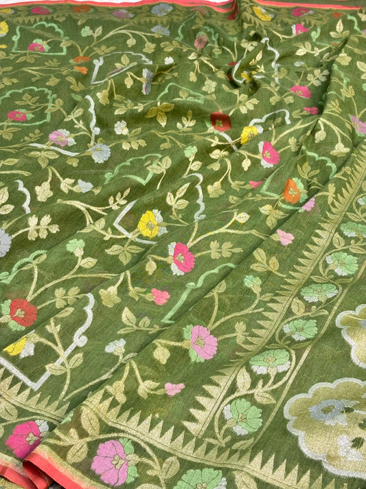 Olive pure cotton jamdani cutwork jaal banarasi saree