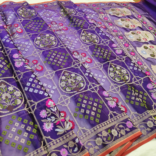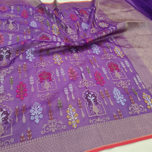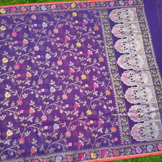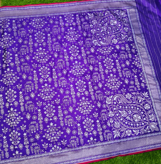 Purple pure katan silk ektara jamdani cutwork jaal banarasi saree