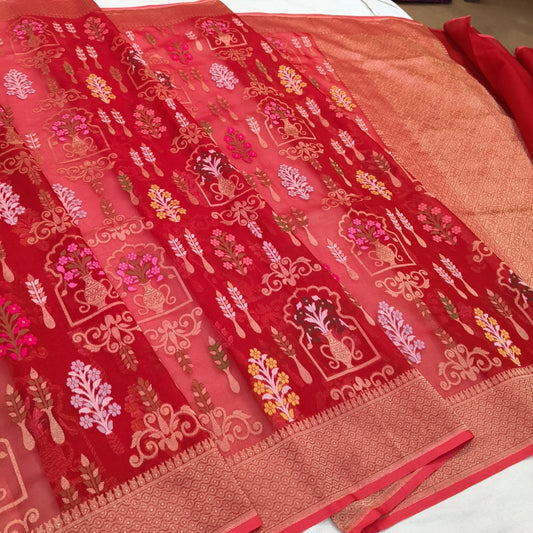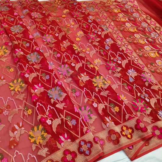 Red pure cotton ektara tilfi jamdani cutwork jaal banarasi saree