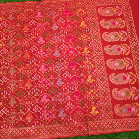 Red pure cotton ektara tilfi jamdani cutwork jaal banarasi saree