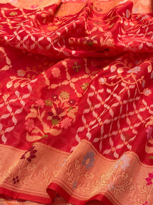 Red Banarasi Kora Jamdani Silk Handwoven Saree