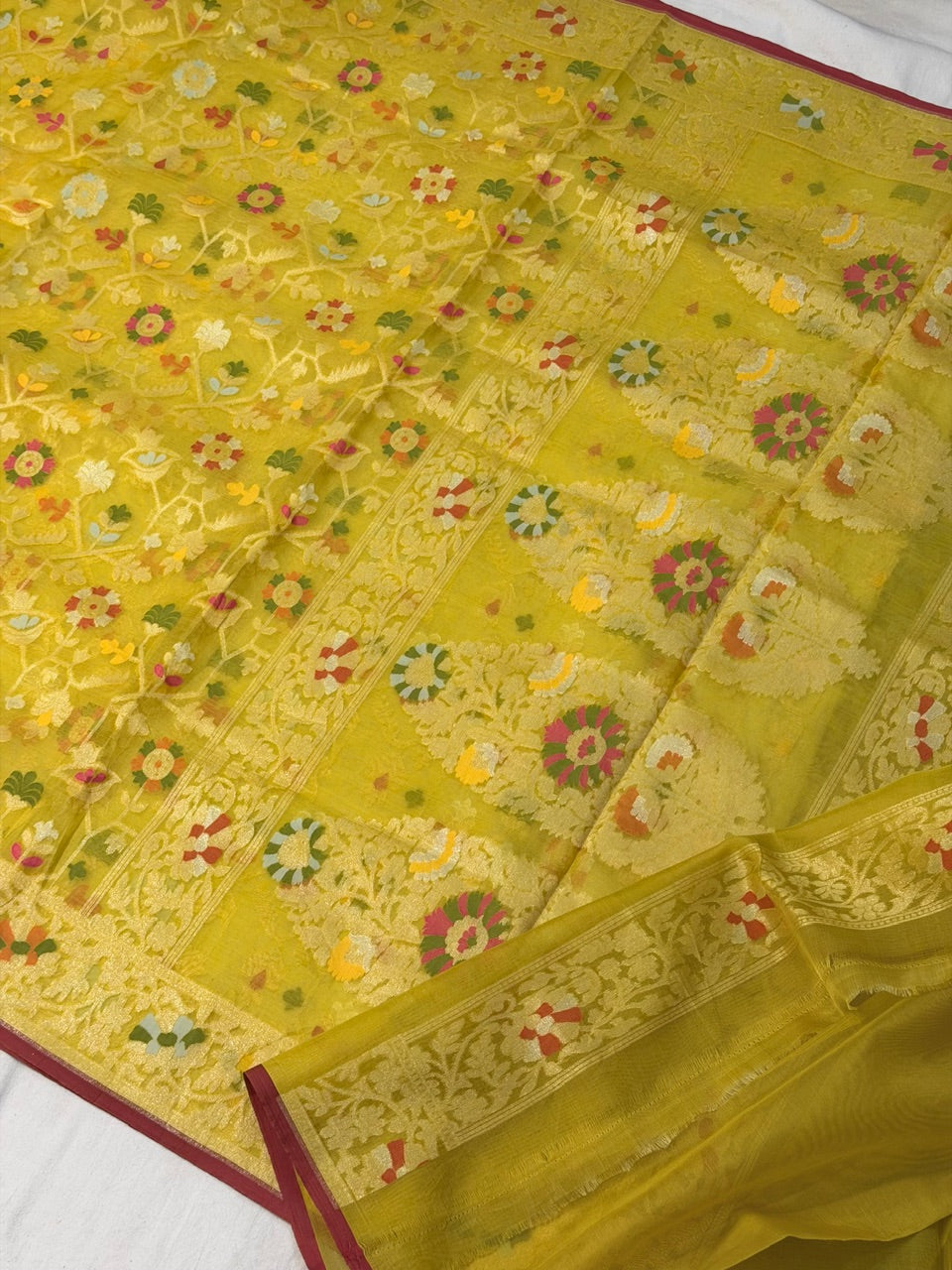 Musterd Yellow Banarasi Kora Jamdani Silk Handwoven Saree