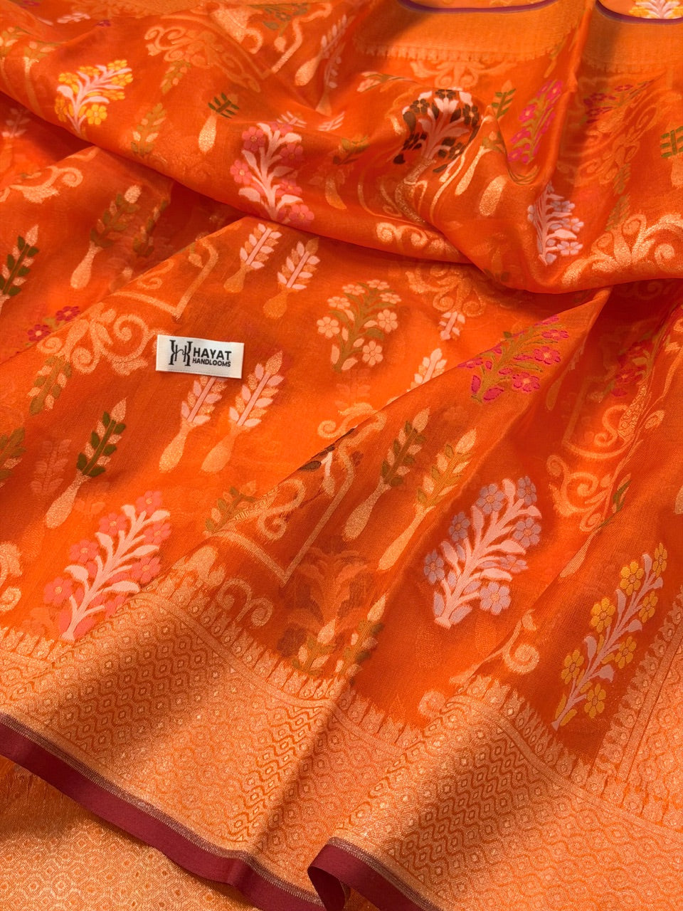 - Weaving Technique: Handwoven Banarasi zari work with intricate detailing