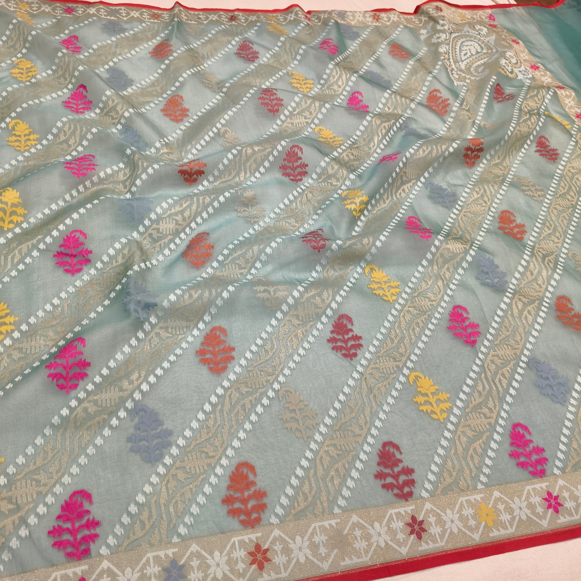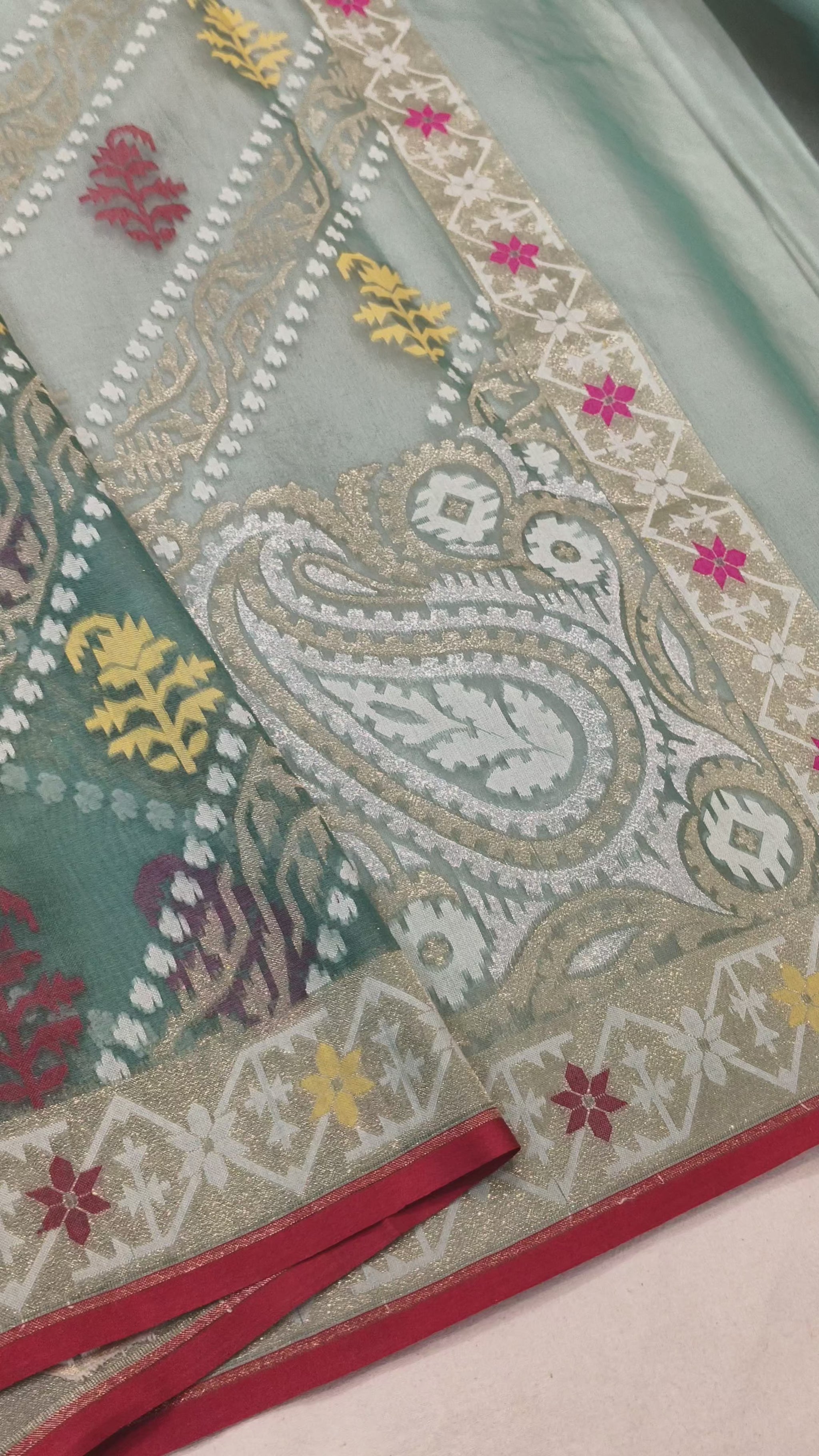 Pure Kora Silk Ektara Tilfi Cutwork Jamdani Banarasi Saree