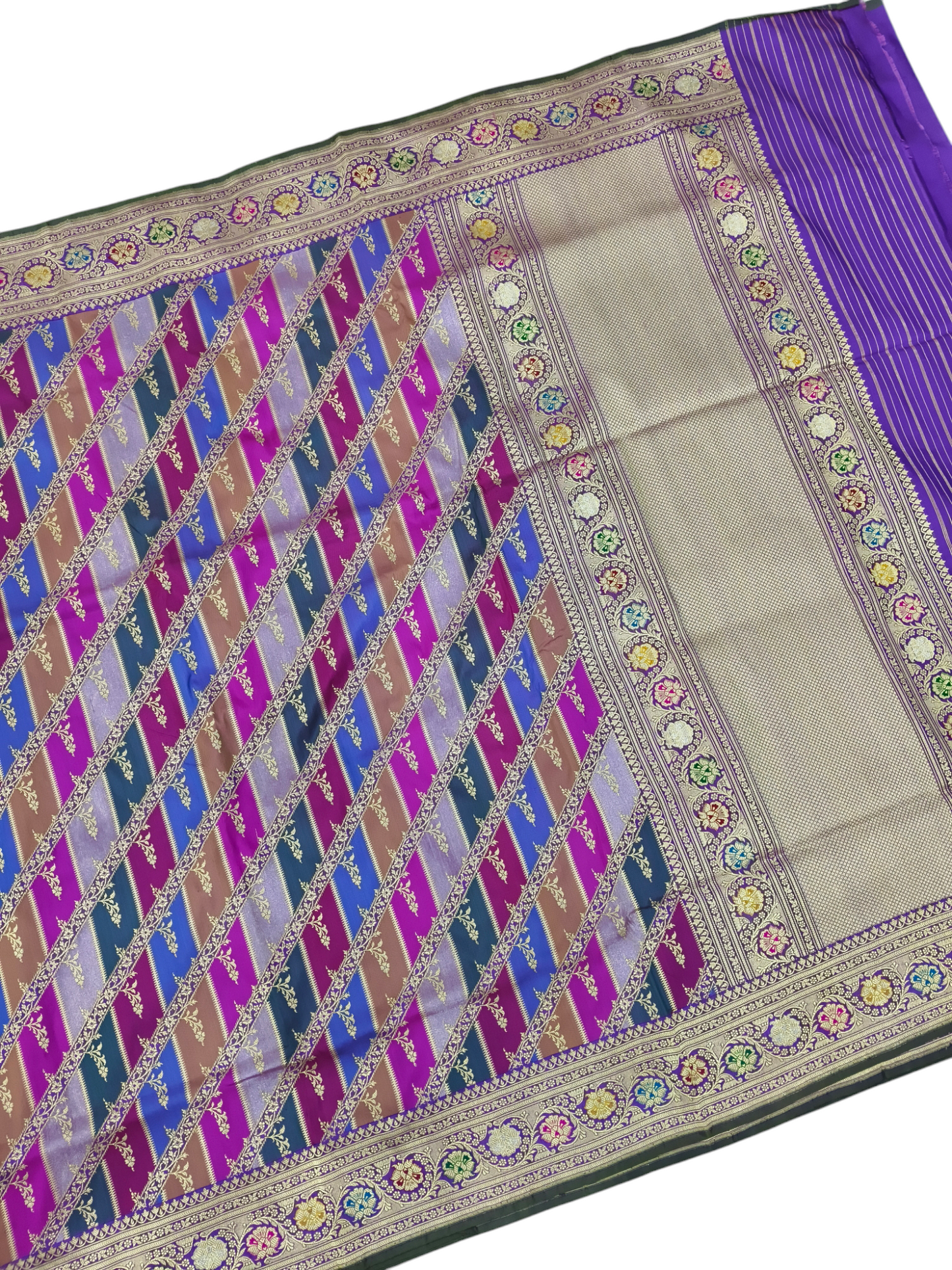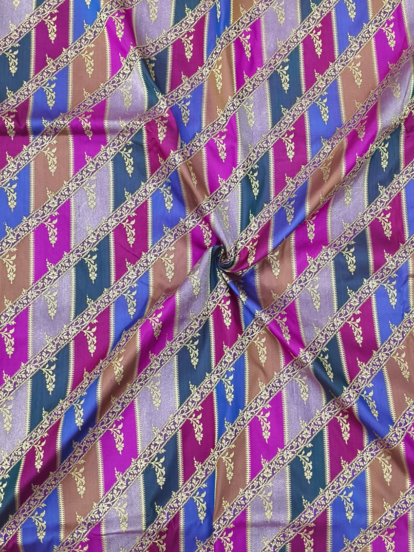 Experience the luxurious feel of our Purple Pure Katan Silk Rangkaat. Made with traditional Rangkaat kadwa weaving, this fabric boasts intricate patterns and high-quality craftsmanship. Elevate your style with this elegant and timeless piece.