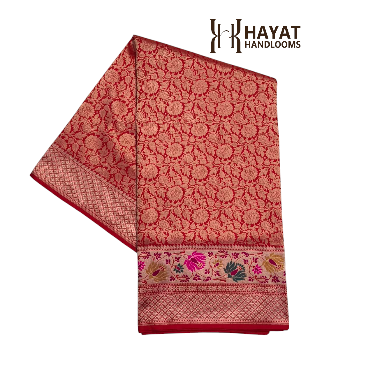 Expertly handwoven with pure katan silk, this red banarasi saree features traditional tanchui weaving. The pathni skirt adds a touch of elegance to the overall design. Perfect for any special occasion, this saree is sure to make you stand out with its intricate details and high-quality material.